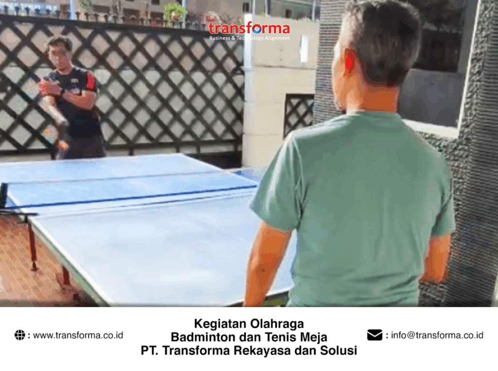 Sebagai bentuk komitmen perusahaan dalam menciptakan lingkungan kerja yang sehat, harmonis, dan penuh semangat, PT. Transforma Rekayasa dan Solusi secara rutin mengadakan kegiatan olahraga bersama, seperti badminton dan tenis meja. Melalui kegiatan ini, karyawan dapat menjaga kebugaran tubuh, mempererat kebersamaan antar tim, serta menumbuhkan sportivitas di dalam lingkungan kerja. Aktivitas olahraga ini juga menjadi sarana untuk melepaskan penat sekaligus memperkuat semangat kolaborasi dalam mencapai visi dan misi perusahaan.